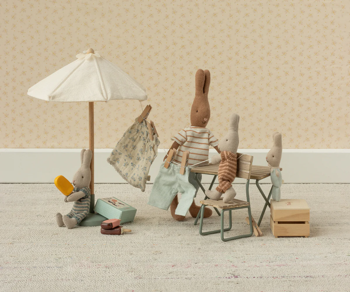 Ten elegancki parasol to nie tylko dekoracja – to realistycznie wykonany element, który urozmaica zabawę i pobudza dziecięcą wyobraźnię. Doskonale komponuje się z innymi akcesoriami z kolekcji Maileg, tworząc pełne ciepła i stylu miniaturowe światy.